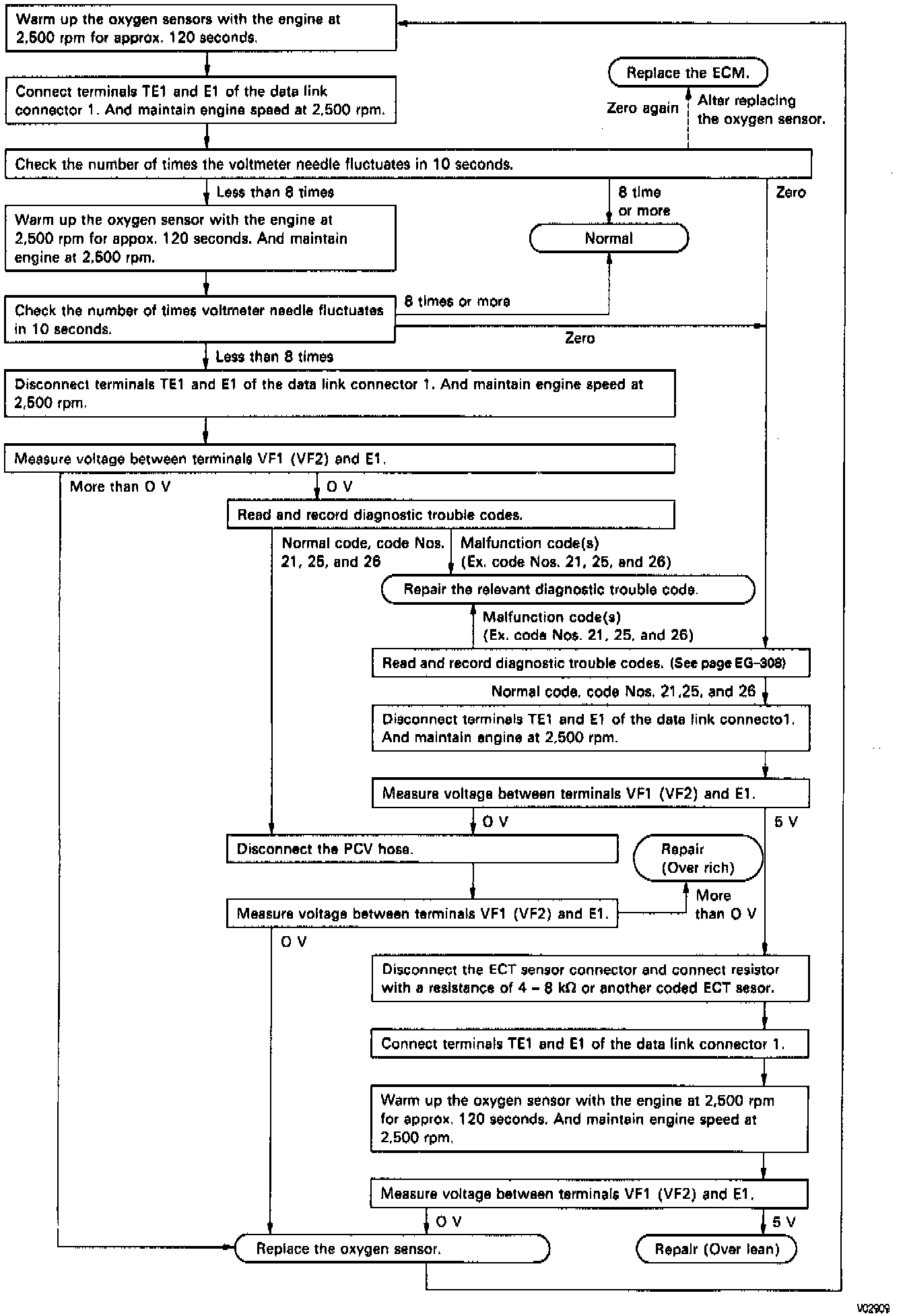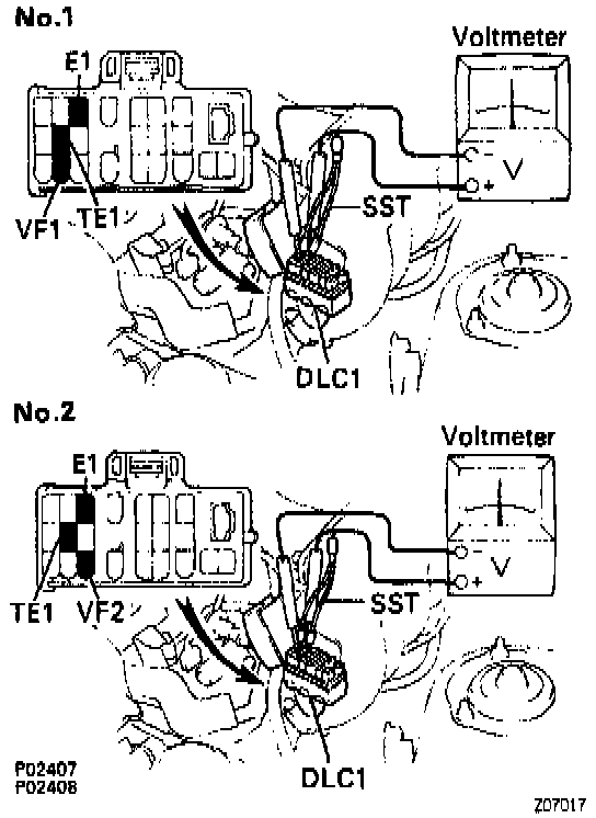 - Connect the positive (+) probe of a voltmeter to terminal VF1 (for sensor No. 1) or VF2 (for sensor No. 2) of the Data Link Connector 1, and negative (-) probe to terminal E1.