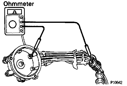 6. Inspect High Tension Cord resistance. Using an ohmmeter, measure the resistance without disconnecting the Distributor Cap.