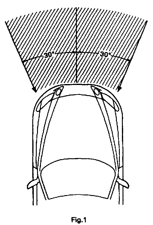 When the vehicle is involved in a frontal collision in the hatched area (Fig. 1) and the shock is larger than a predetermined level, the SRS is activated automatically. A safing sensor is designed to go on at a smaller deceleration rate than the front and center airbag sensors. As illustrated in Fig. 2, ignition is caused when current flows to the squib, which happens when a safing sensor and a front airbag sensor and/or the center airbag sensor go on simultaneously. When a deceleration force acts on the sensors, driver airbag and front passenger airbag ignite and generate gas. The gas discharging into the driver and front passenger airbags rapidly increases the pressure inside the bags breaking open the steering wheel pad and instrument panel door.