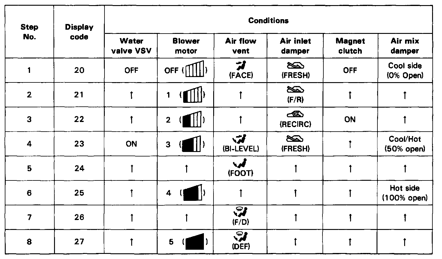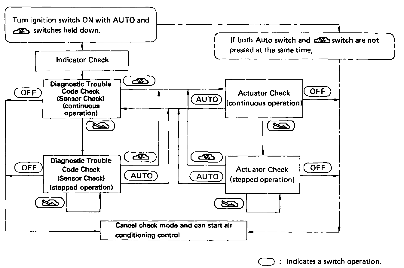 By operating each of the air conditioning control switches as shown in the diagram above, it is possible to enter the diagnosis check mode.
