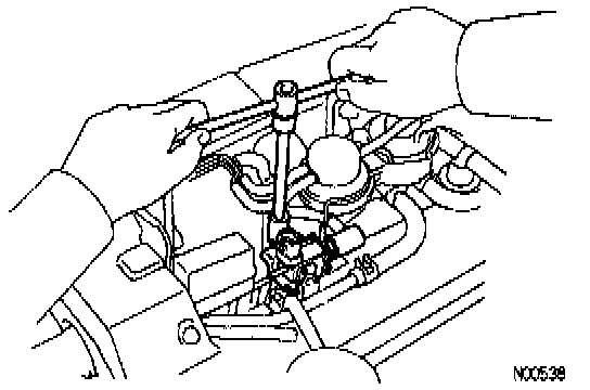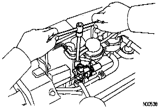 CAUTION: Work must be started after 90 seconds from the time the ignition switch is turned to the LOCK position and the negative (-) terminal cable is disconnected from the battery.