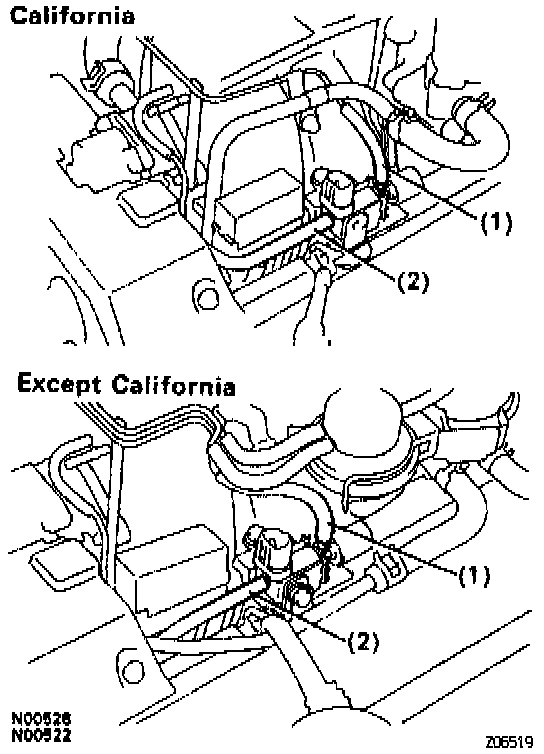2. Except California: Install the water bypass pipe to the vacuum switching valve with the bolt.