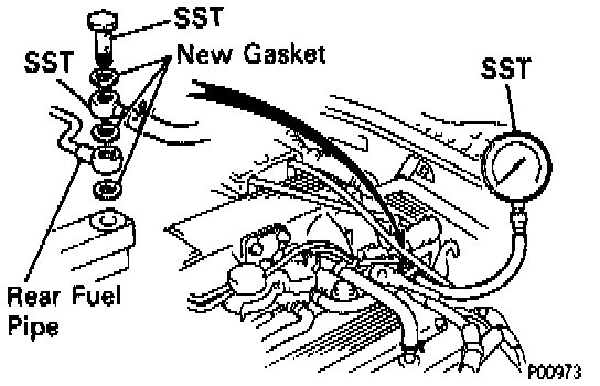 5. Install the rear fuel pipe and pressure gauge to the left hand delivery pipe with 3 new gaskets and the union bolt. (SST 09268-45012)