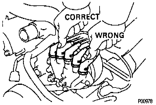 NOTICE: Connect the high-tension cord by pressing on the correct place as shown in the illustration. If not done this way, the high-tension cord will interfere with the camshaft timing pulley.
