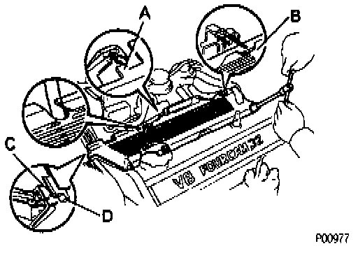 - Fit portions C and D of the engine wire cover, matching them with the lower high-tension cord cover and No.3 timing belt cover.