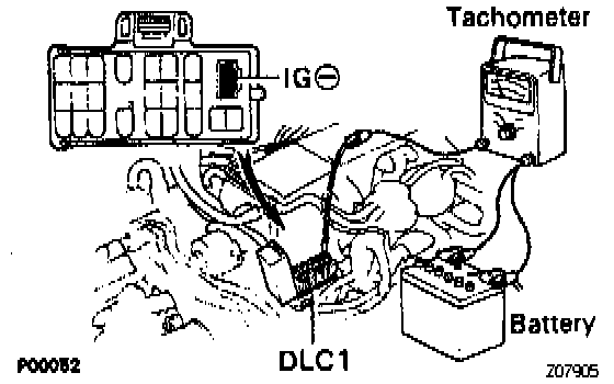 - Connect the tester probe of a tachometer to terminal IG- of the Data Link Connector 1. Set the tachometer to the 4 cylinder range.