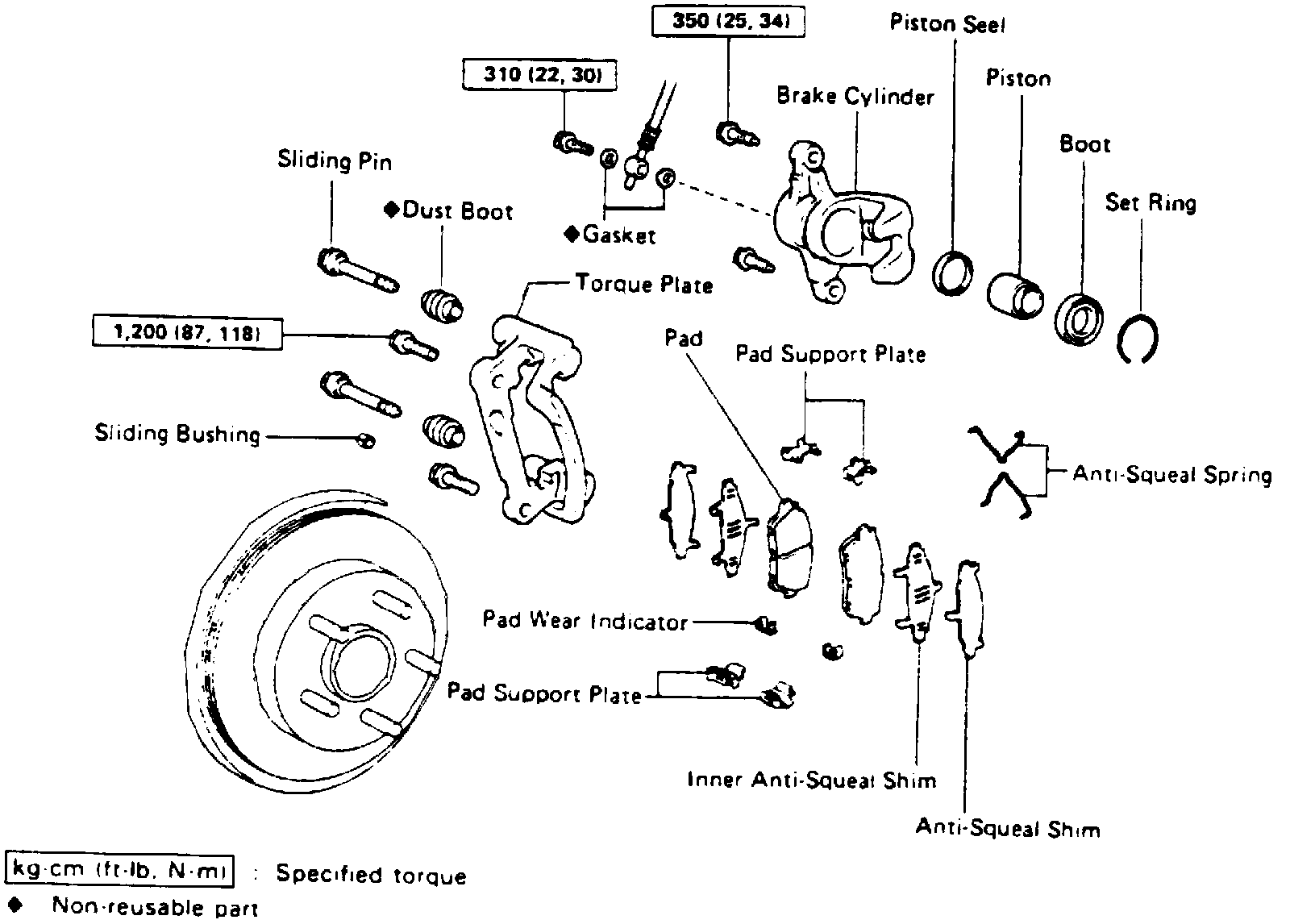 1. Remove caliper bolts from torque plate, Figs. 1 through 3, then the caliper. Suspend caliper securely. Do not let caliper hang by brake hose.