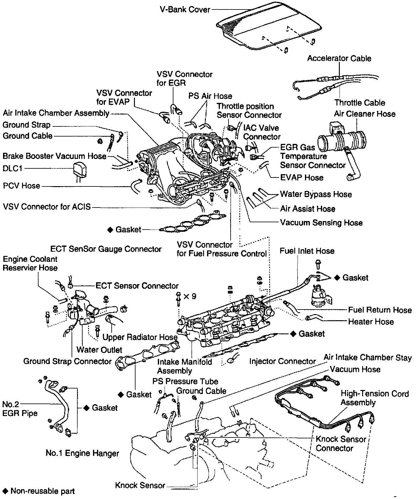 - Install the intake manifold assembly with the 9 bolts, 2 plate washers and 2 nuts.