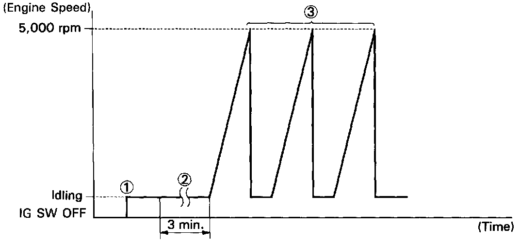 3. With the A/C ON, quickly race the engine to 5,000 rpm 3 times. (Rapidly depress the accelerator pedal and suddenly release it.)