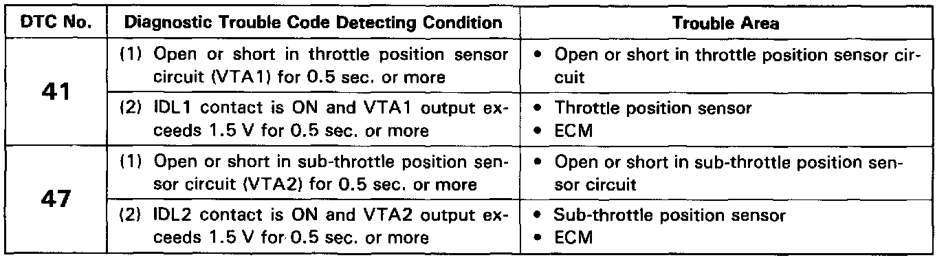 - Signals from the throttle position sensor(s) are also input to the TRAC ECU. So when a malfunction occurs on the TRAC side, code 41 or 47 may be displayed.