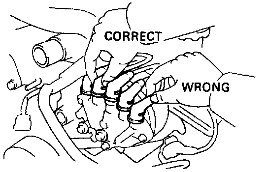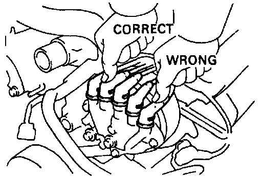 NOTICE: Connect the high-tension cord by pressing on the correct place as shown in the illustration. If not done this way. the high-tension cord will interfere with the camshaft timing pulley.