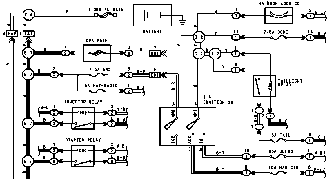 The Chart shows the route by which current flows from the battery to each electrical source (Fusible Link, Circuit Breaker, Fuse, etc.) and other parts