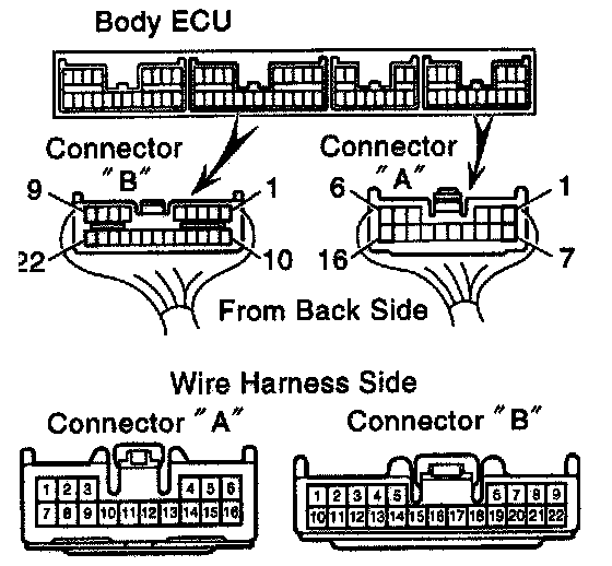 Disconnect the connector from the body ECU and inspect the connector on the wire harness side. as shown.
