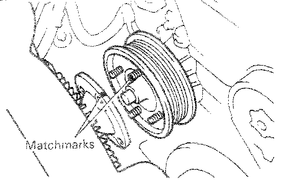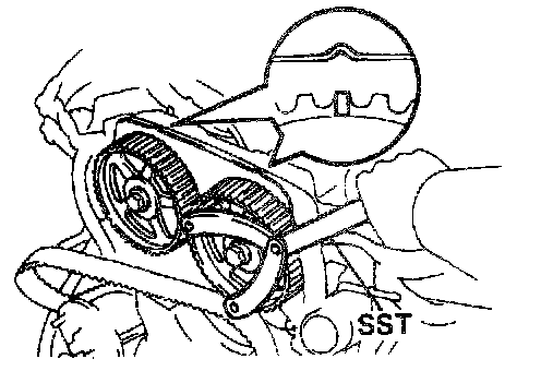 (b) Check that each pulley aligns with the timing marks as shown in the illustration. If the marks do not align. remove the timing belt ane reinstall it.