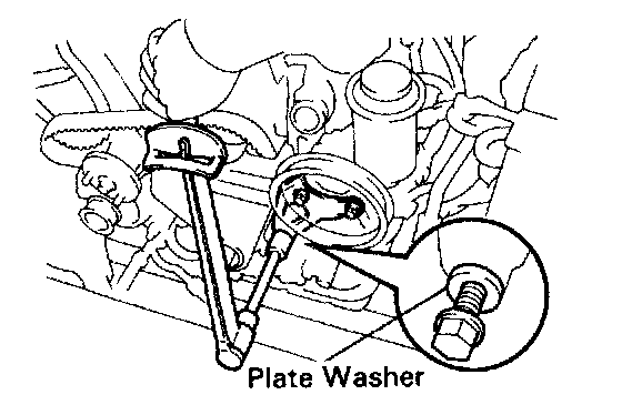 (b) Using a 10 mm hexagon wrench, install the plate washer and pulley with the pivot bolt.