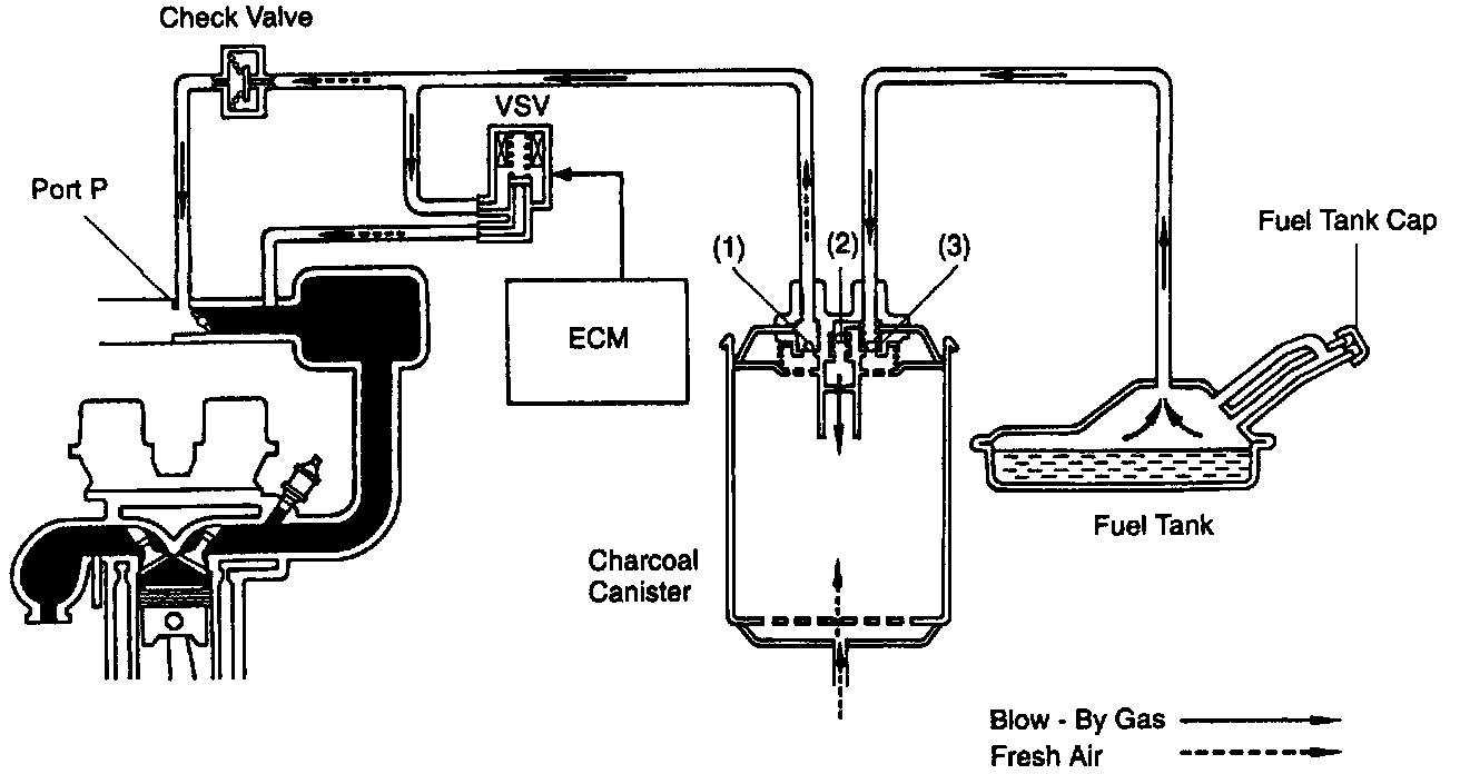 The ECM controls the on-off period of the Vacuum Switching Valve (VSV) to adjust the EVAP purge quantity in accordance with the engine load.
