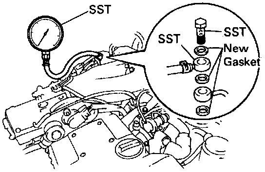 - Install the fuel inlet pipe and SST 09268-45012 (pressure gauge) to the delivery pipe with 3 new gaskets and the union bolt.