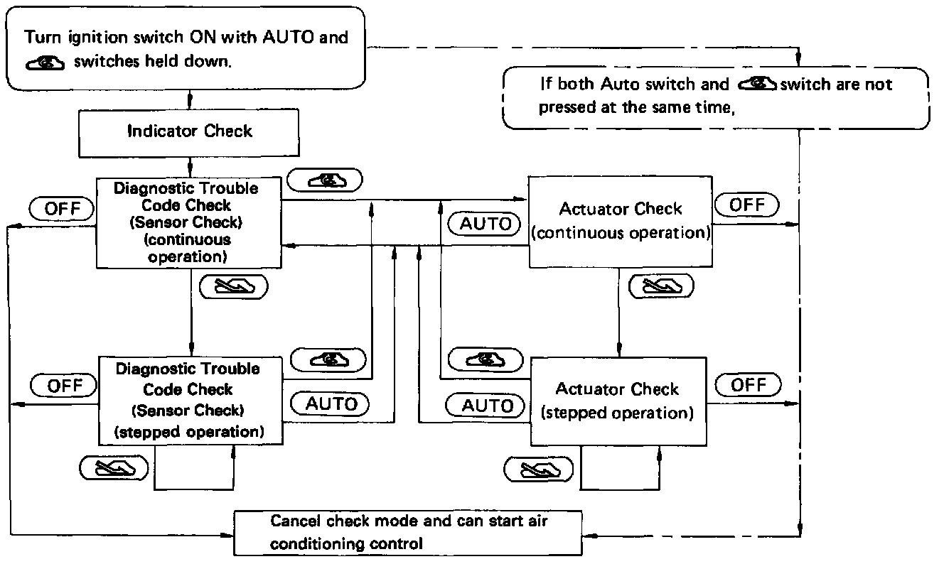By operating each of the air conditioning control switches as shown in the diagram above, it is possible to enter the diagnosis check mode.