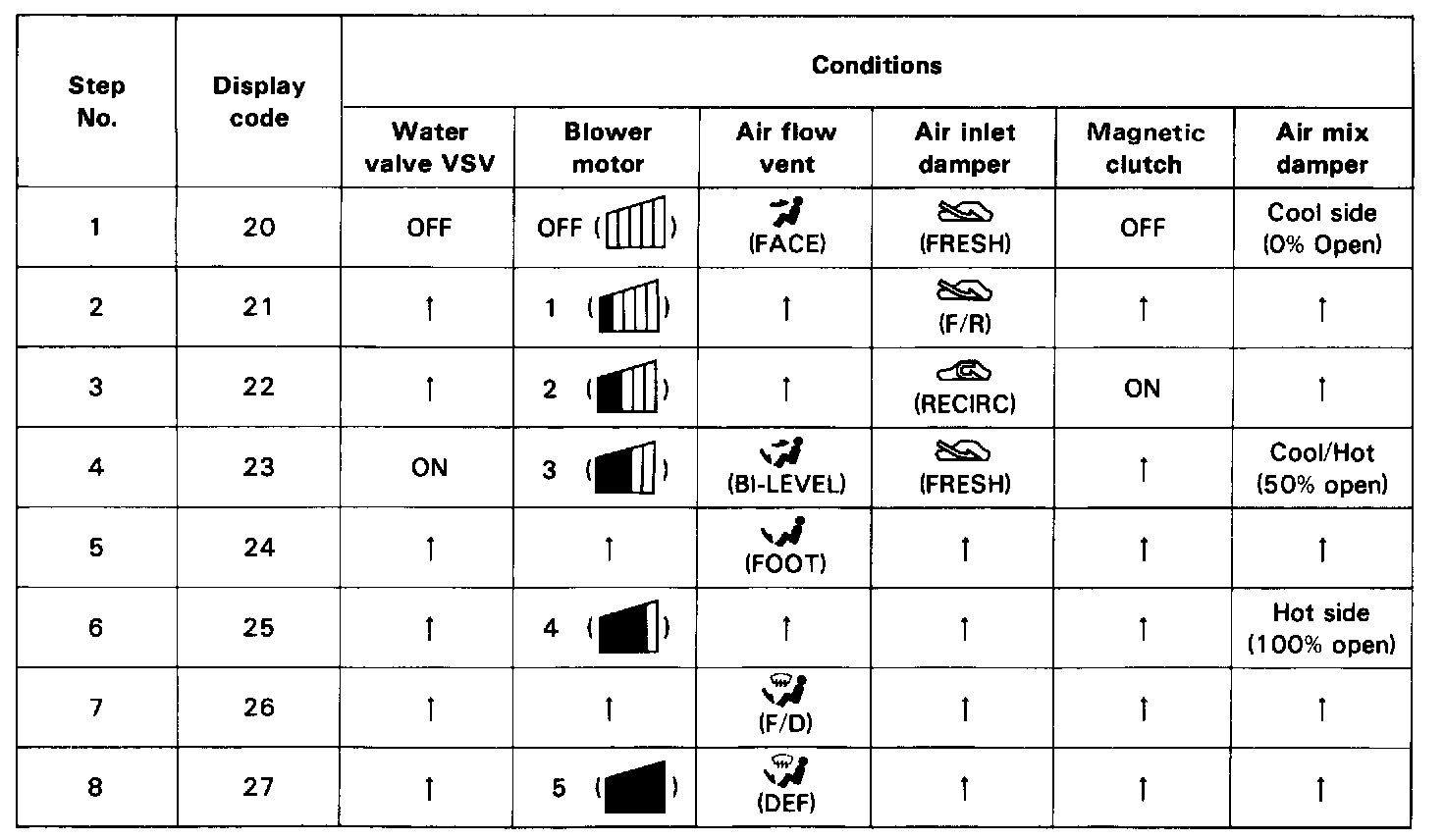 2. Since each damper, motor and relay automatically operates at 1 second intervals beginning in order from 20 in the temperature display, check the temperature and air flow visually and by hand.