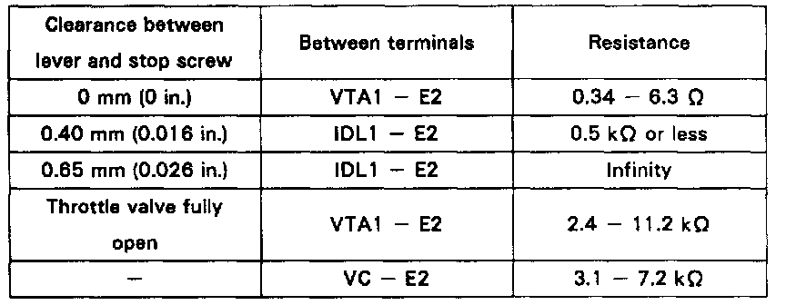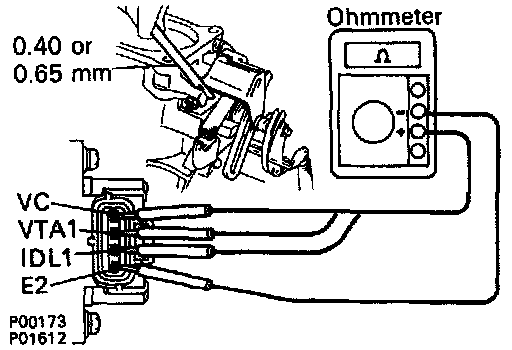 Insert a 0.40 mm (0.016 in) or 0.65 mm (0.026 in) feeler gauge between the throttle stop screw and stop lever.