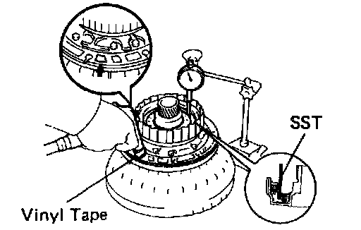 b. Using SST and a dial indicator, measure the O/D direct clutch piston stroke while applying and releasing compressed air (392 - 785 kPa, 4 - 8 kgf/cm2, 57 - 114 psi).