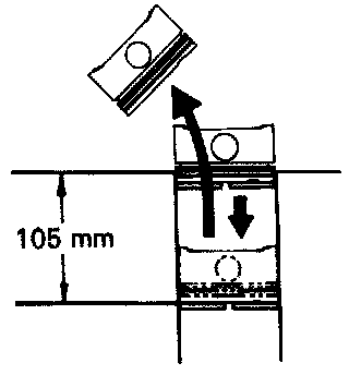 (b) Using a piston. push the piston ring a little beyond the bottom of the ring travel, 105 mm (4.13 in.) from the top of the cylinder block.