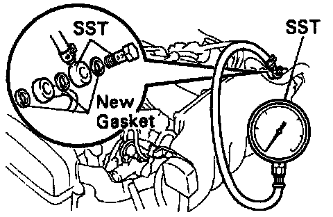 (s) After checking fuel pressure, disconnect the negative (-) terminal cable from the battery and carefully remove SST to prevent gasoline from splashing. SST 09268-45012