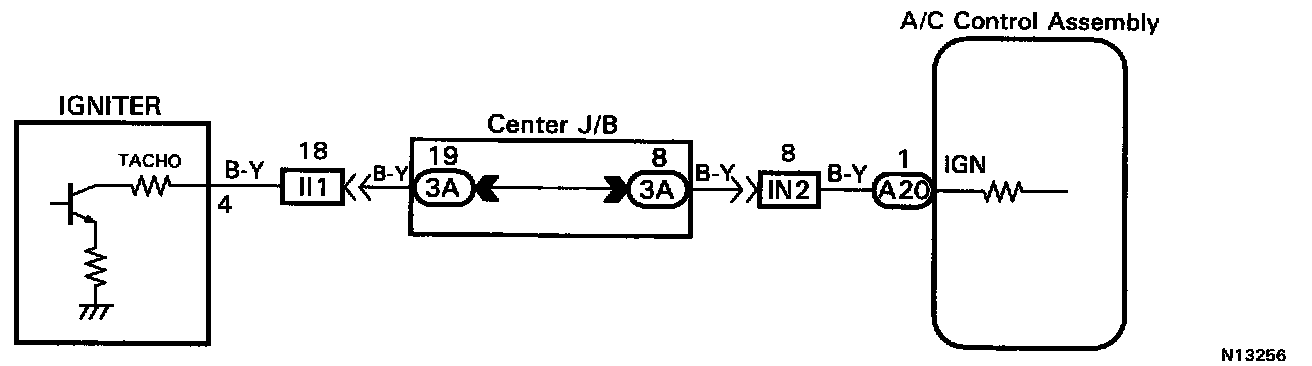control assembly monitors the engine speed through signals sent from the igniter. The air conditioning control assembly uses these signals and compressor speed signals to detect the compressor lock condition.
