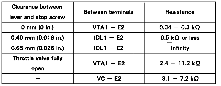 - Insert a 0.40 mm (0.016 in.) feeler gauge, between the throttle stop screw and stop lever.