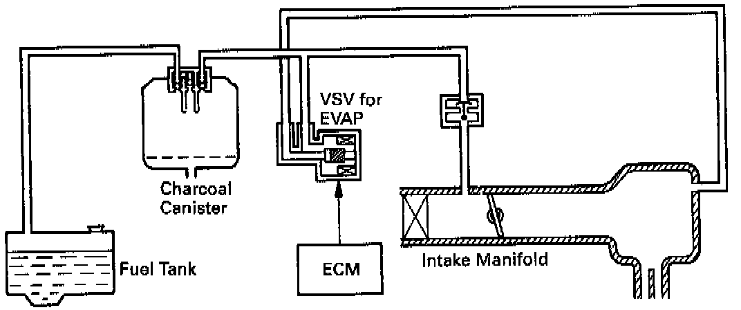To reduce HC emissions, evaporated fuel from the fuel tank is routed through the charcoal canister to the intake manifold for combustion in the cylinders.