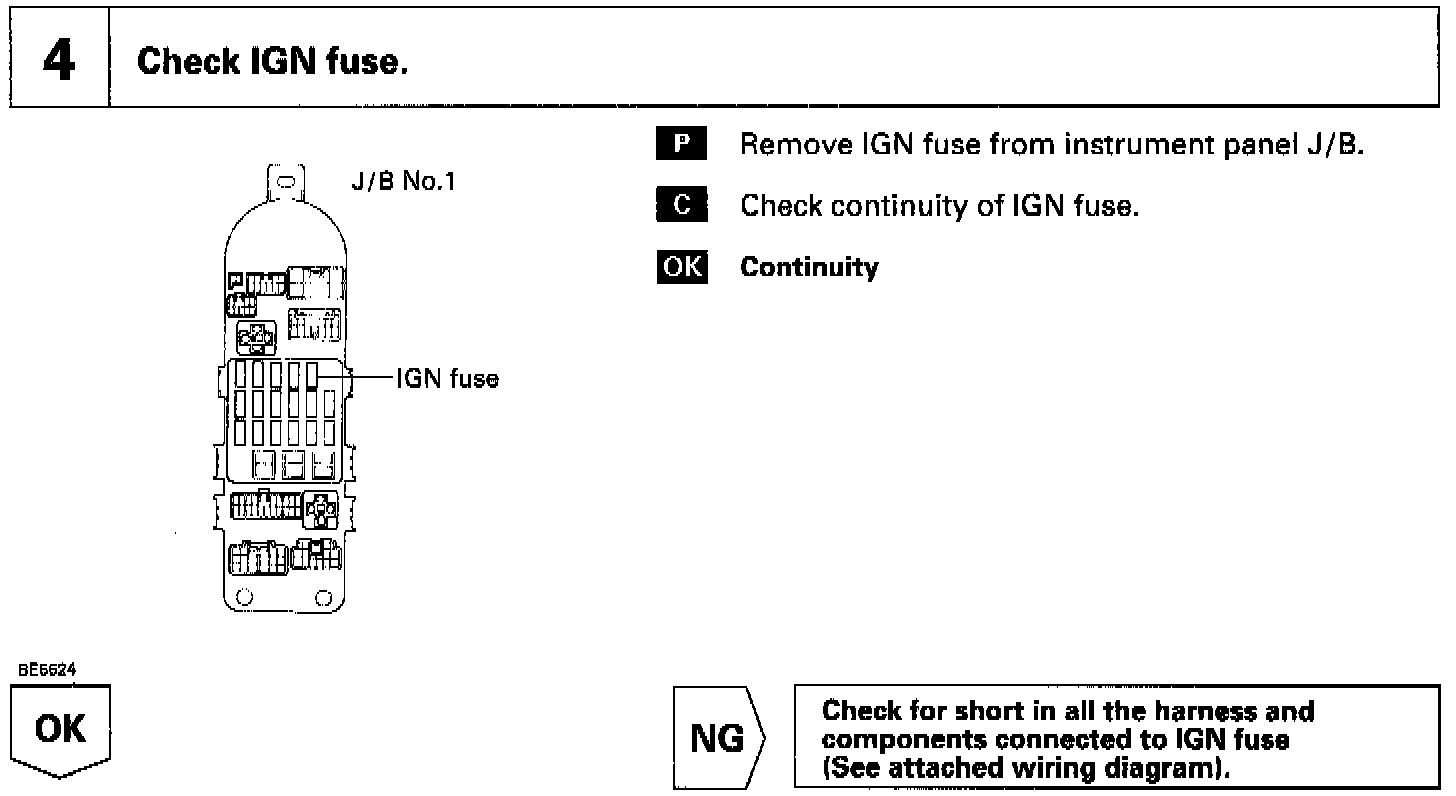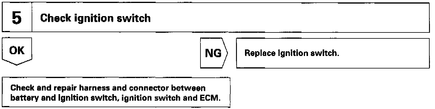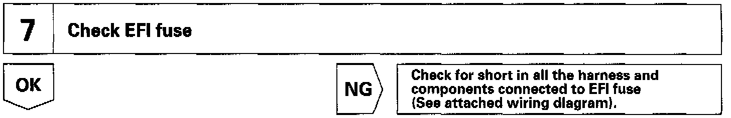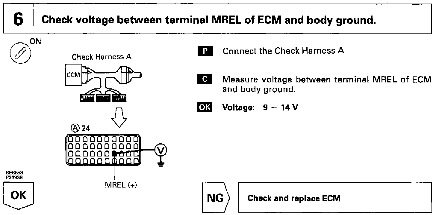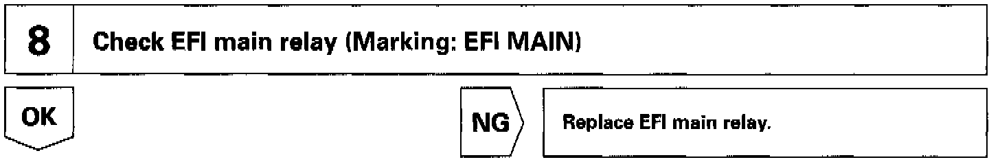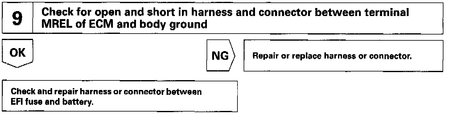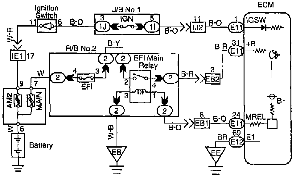 When the ignition switch is turned on, battery positive voltage is applied to the terminal IG SW of the ECM and the EFI main relay control circuit in the ECM sends a signal to the terminal MREL of the ECM switching on the EFI main relay.