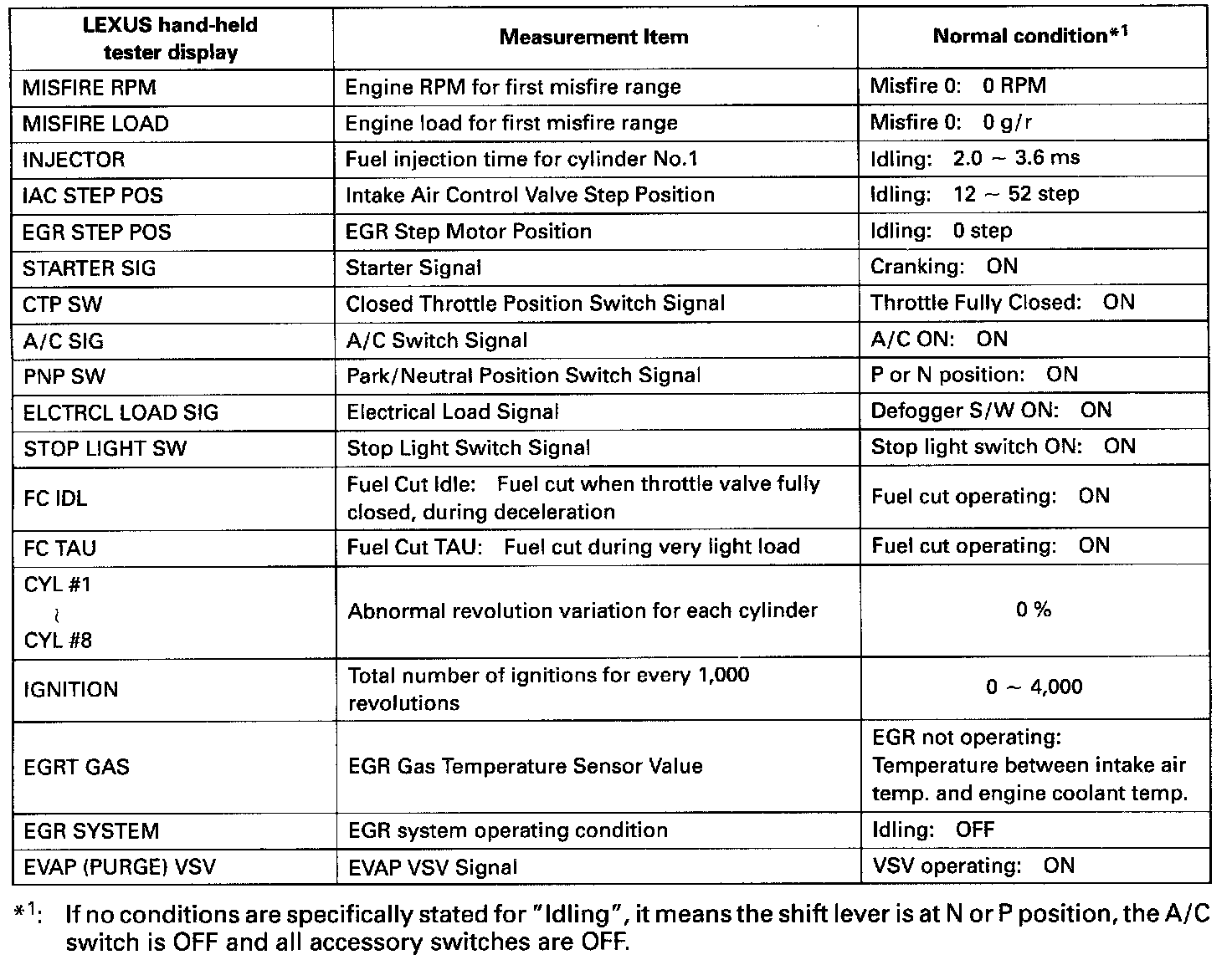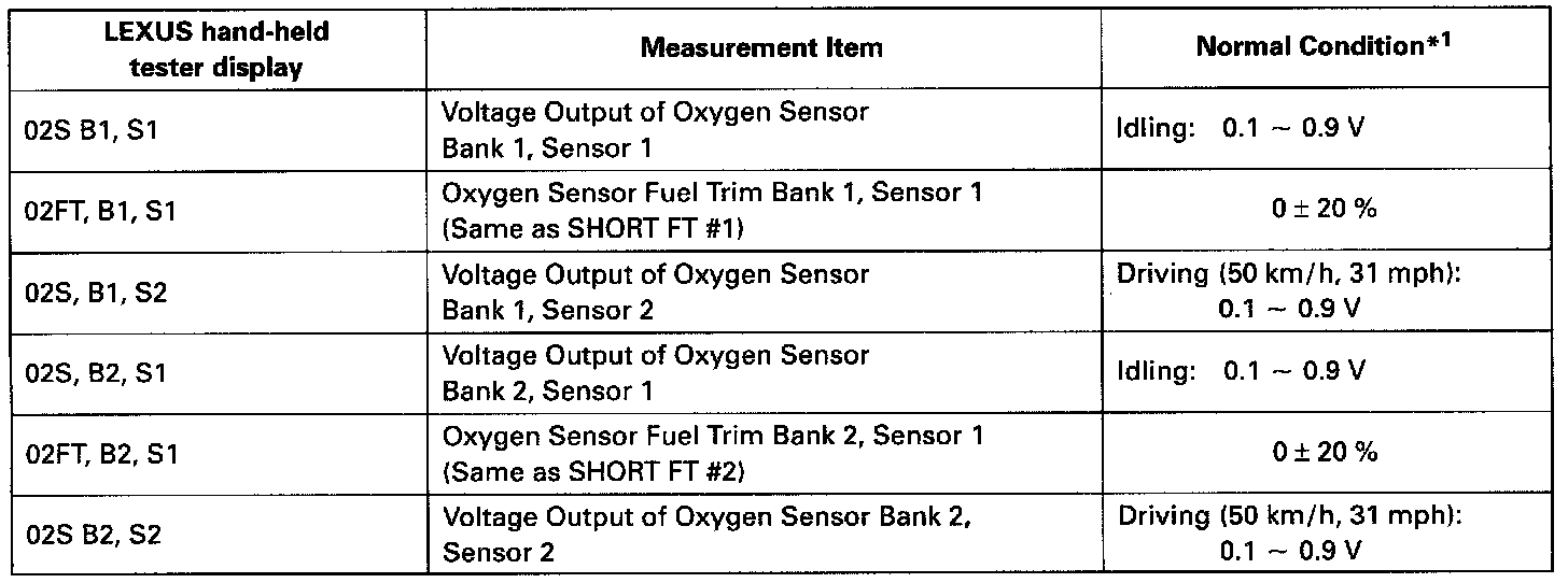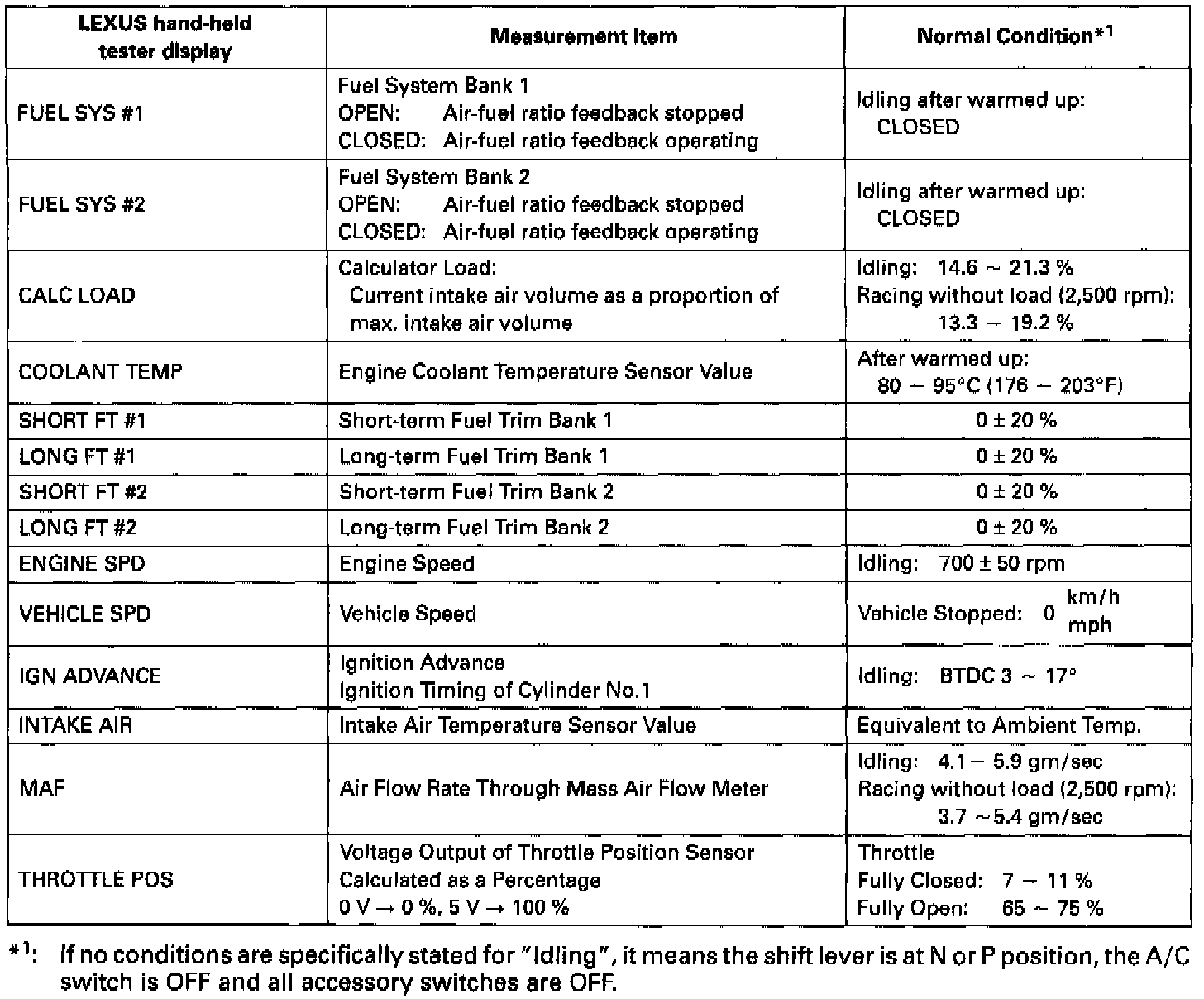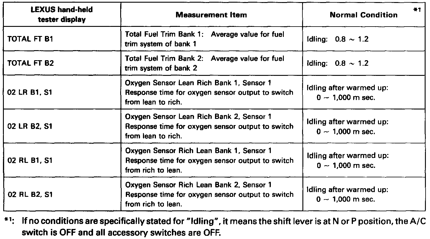 NOTICE: The values given below for "Normal Condition" are representative values, so a vehicle may still be normal even if its value varies from those listed here. So do not decide whether a part is faulty or not solely according to the "Normal Condition" here.