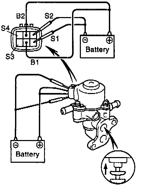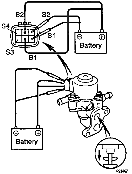- Apply battery voltage to terminal B1 and B2, and while repeatedly grounding (*S1) - (S1 and *S2) - (S2 and *S3) - (S3 and *S4) - (S4 and S1) in sequence, check that the valve moves toward the closed position.