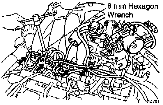 (b) Using an 8 mm hexagon wrench, install the cylinder head bolt on each cylinder head, then repeat for the other side, as shown.
