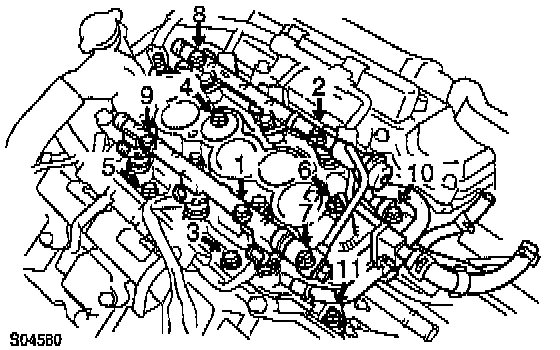 (e) Retighten the cylinder head bolts by 90° in the numerical order shown.