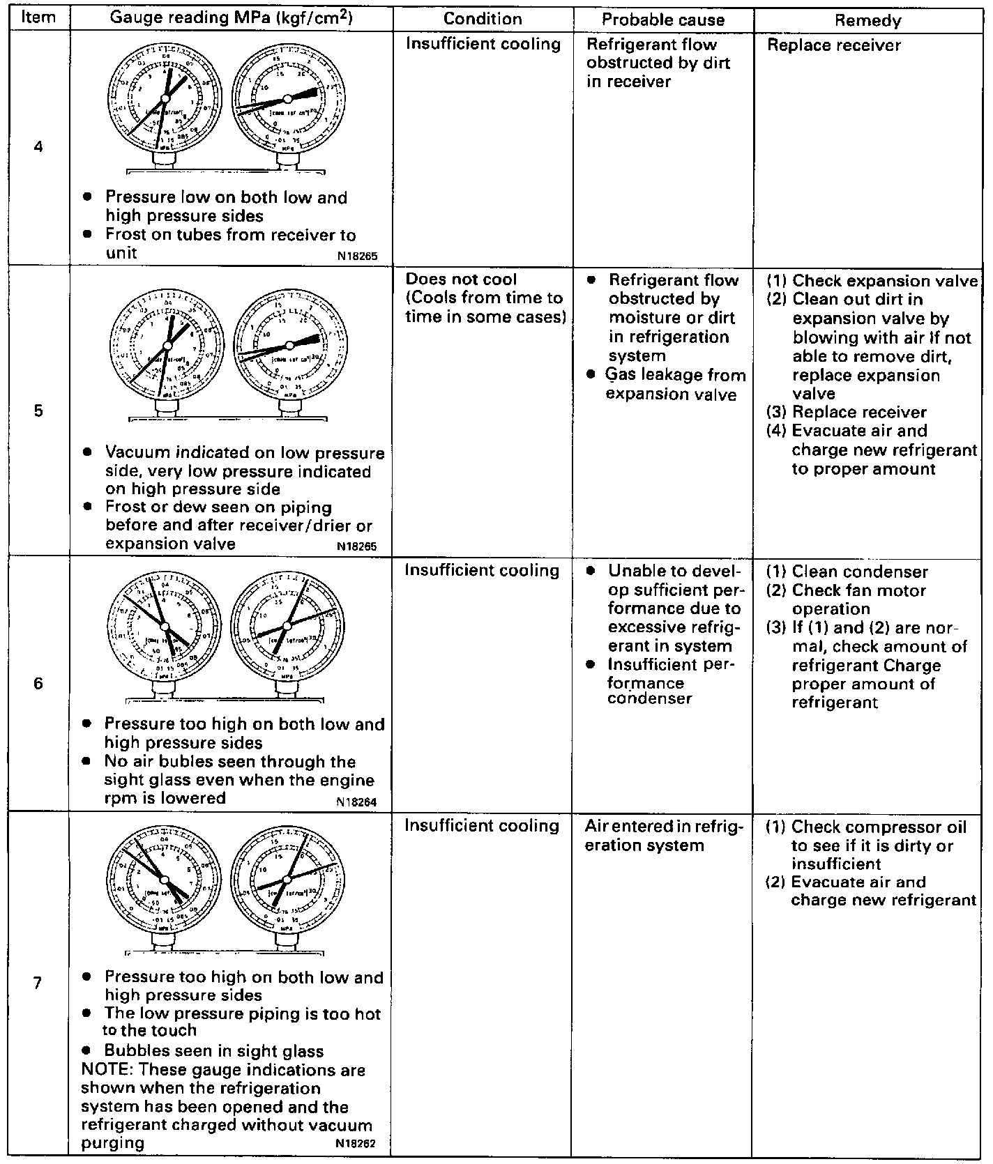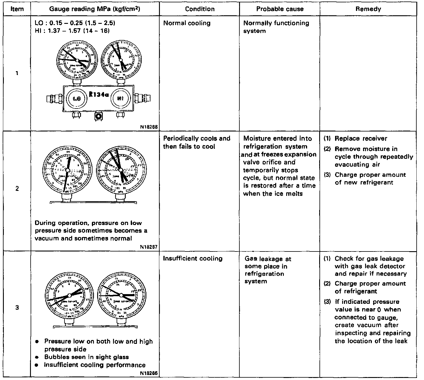 This is a method in which the trouble is located by using a manifold gauge set. Read the manifold gauge pressure when these conditions are established: