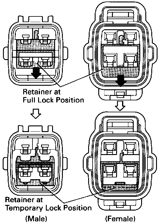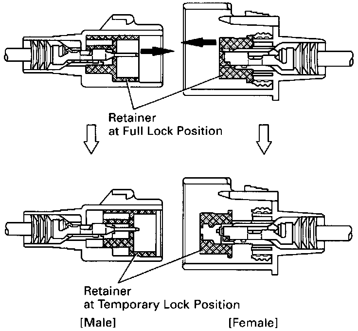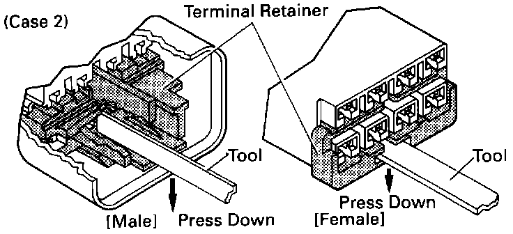 Insert the special tool into the terminal retainer access hole (Mark) and pull the terminal retainer up to the temporary lock position.