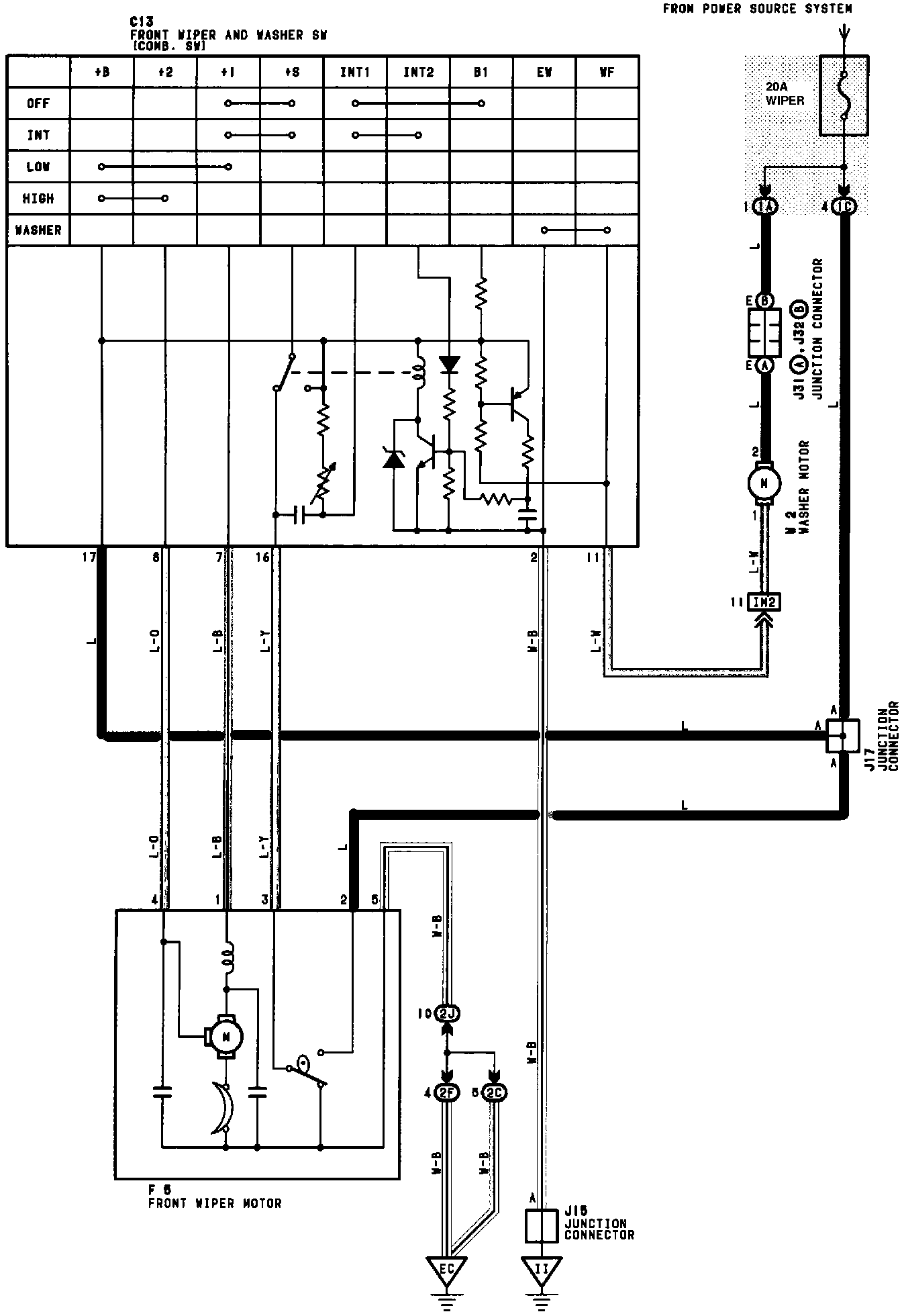 When the Wiper SW is turned to LOW position, current flows through TERMINAL 17 of the Front Wiper and Washer SW to TERMINAL 7 --> TERMINAL 1 of the Front Wiper Motor --> TERMINAL 5 --> GROUND, causing the Wiper Motor to operate at low speed.