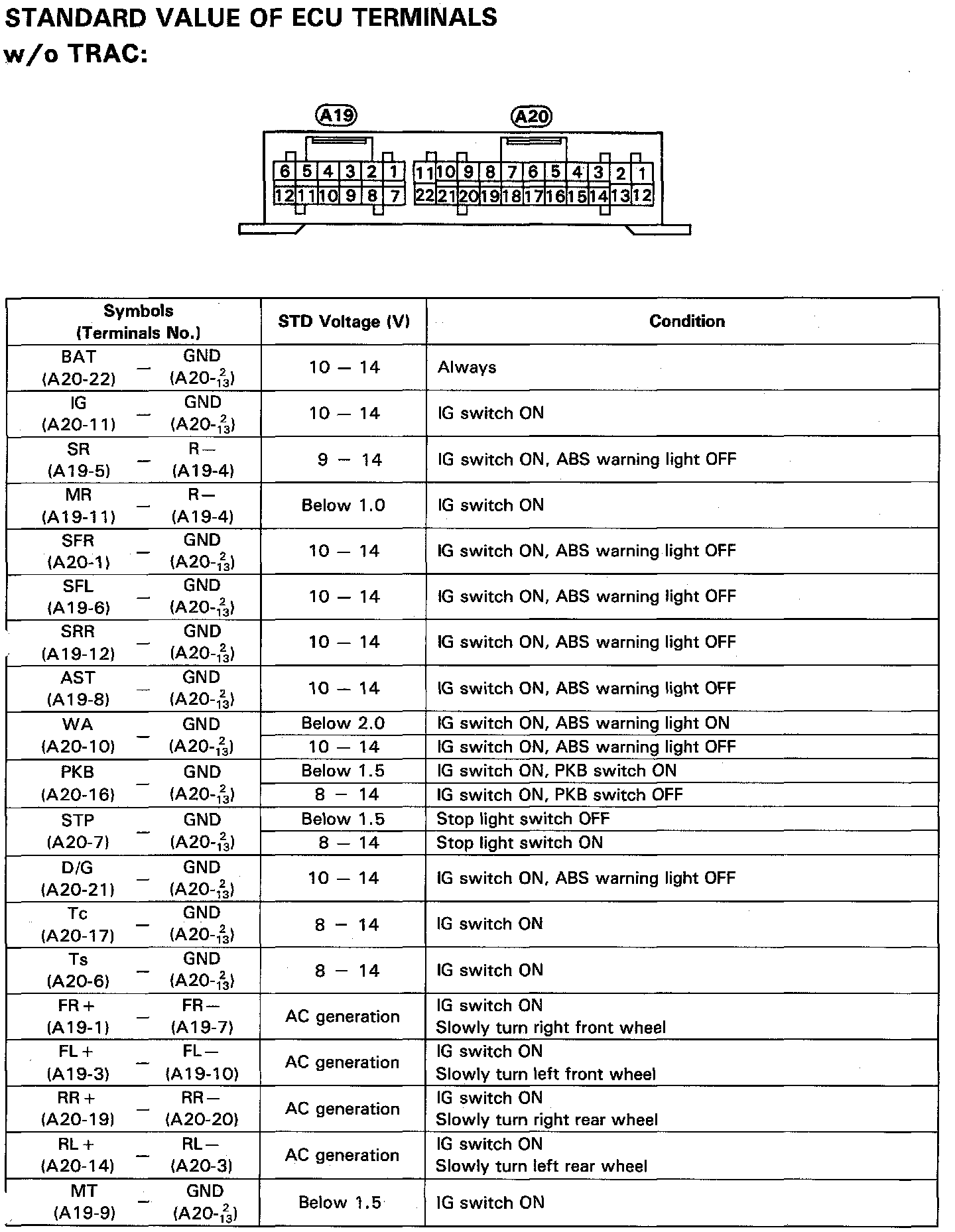 ECU Terminals And Standard Values Chart (w/o TRAC):