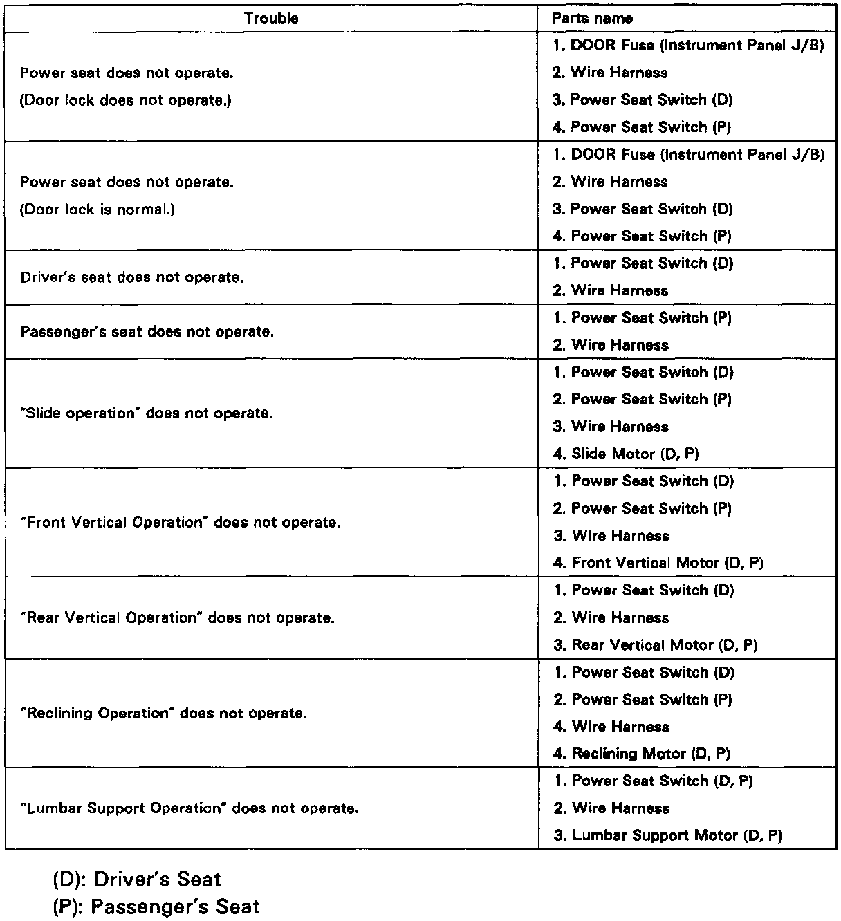 The table above will be useful for you in troubleshooting these electrical problems. The most likely causes of the malfunction are shown in the order of their probability. Inspect each part in the order shown, and replace the part when it is found to be faulty.