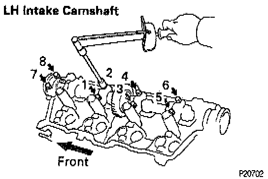 (j) Using the sequence shown uniformly tighten the eight bolts on the bearing caps of the exhaust camshaft in several passes to 16 Nm (160 kg.cm, 12 ft.lb).