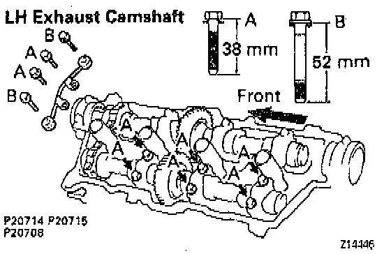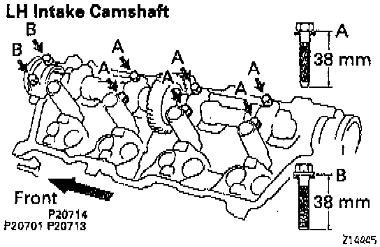 - Use bearing cap bolts 38 mm (1.50 in) in length. The bolts are black (A) or silver (B) in color. Install the two silver bolts to the front bearing cap. Install the six black bolts to the other positions.