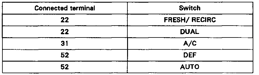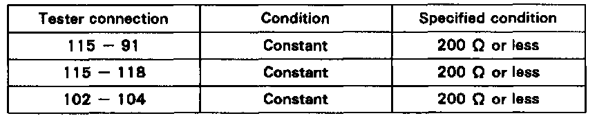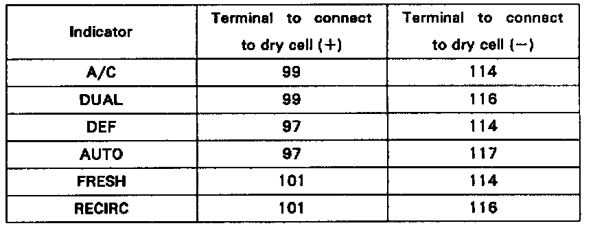 c. Connect the positive (+) lead from the battery terminal 115 and negative (-) lead to terminal and 91, 118 and then check that the illumination lights up. If operation is as specified, replace the A/C amplifier. If operation is not as specified, proceed next inspection.