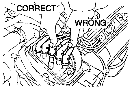 NOTICE: Install the high-tension cord by pressing on the correct piece as shown in the illustration. If not done this way. the high-tension cord will interfere with the camshaft timing pulley.