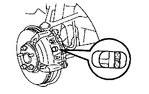 2. Check the pad thickness through the caliper inspection hole and replace pads if not within specifications, or if the pads have severe, uneven wear.