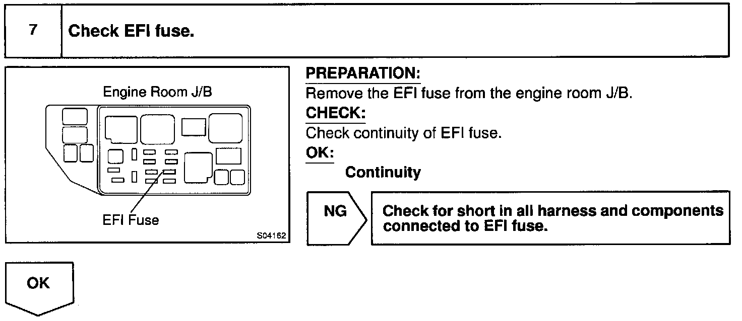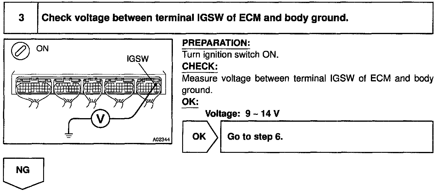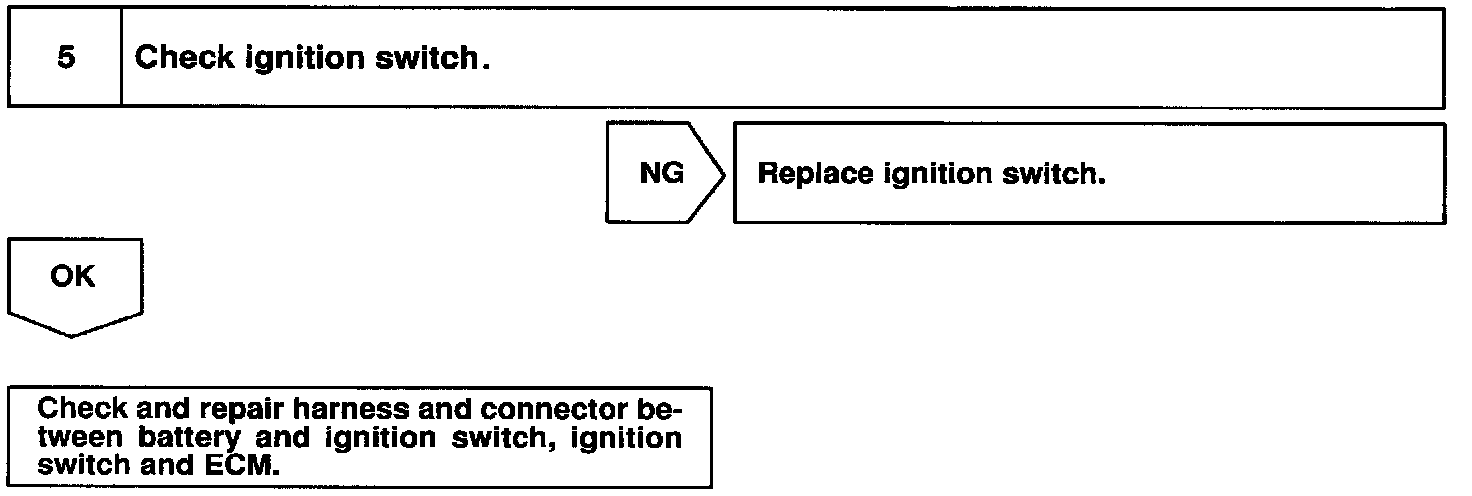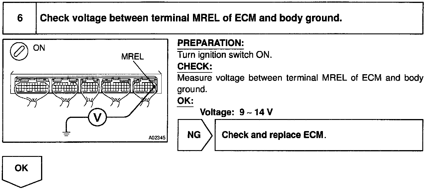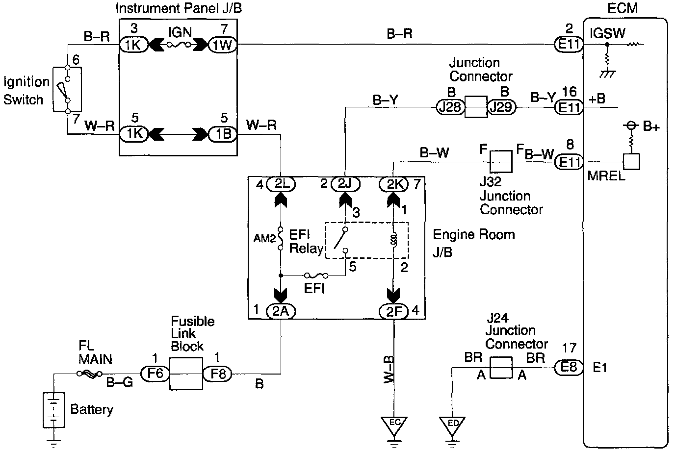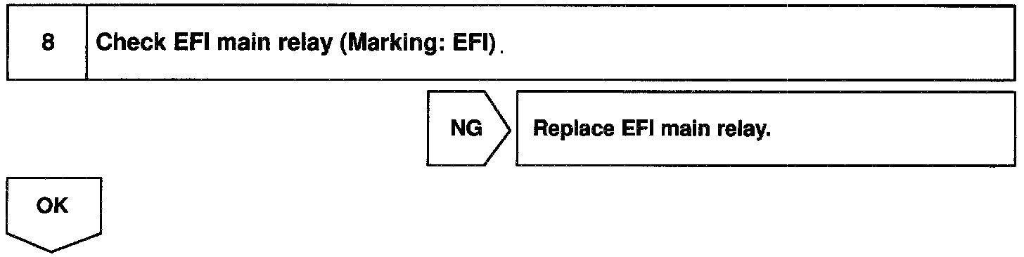 When the ignition switch is turned ON, battery positive voltage is applied to terminal IGSW of the ECM and the EFI main relay (Marking: EFI) control circuit in the ECM sends a signal to the terminal MREL of the ECM switching on the EFI main relay.