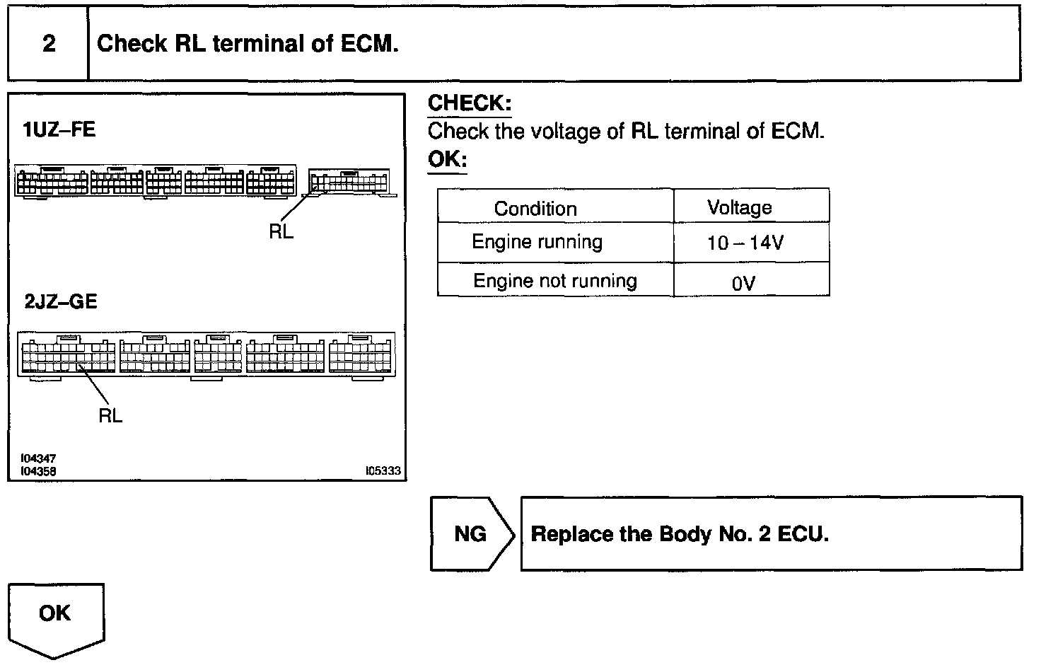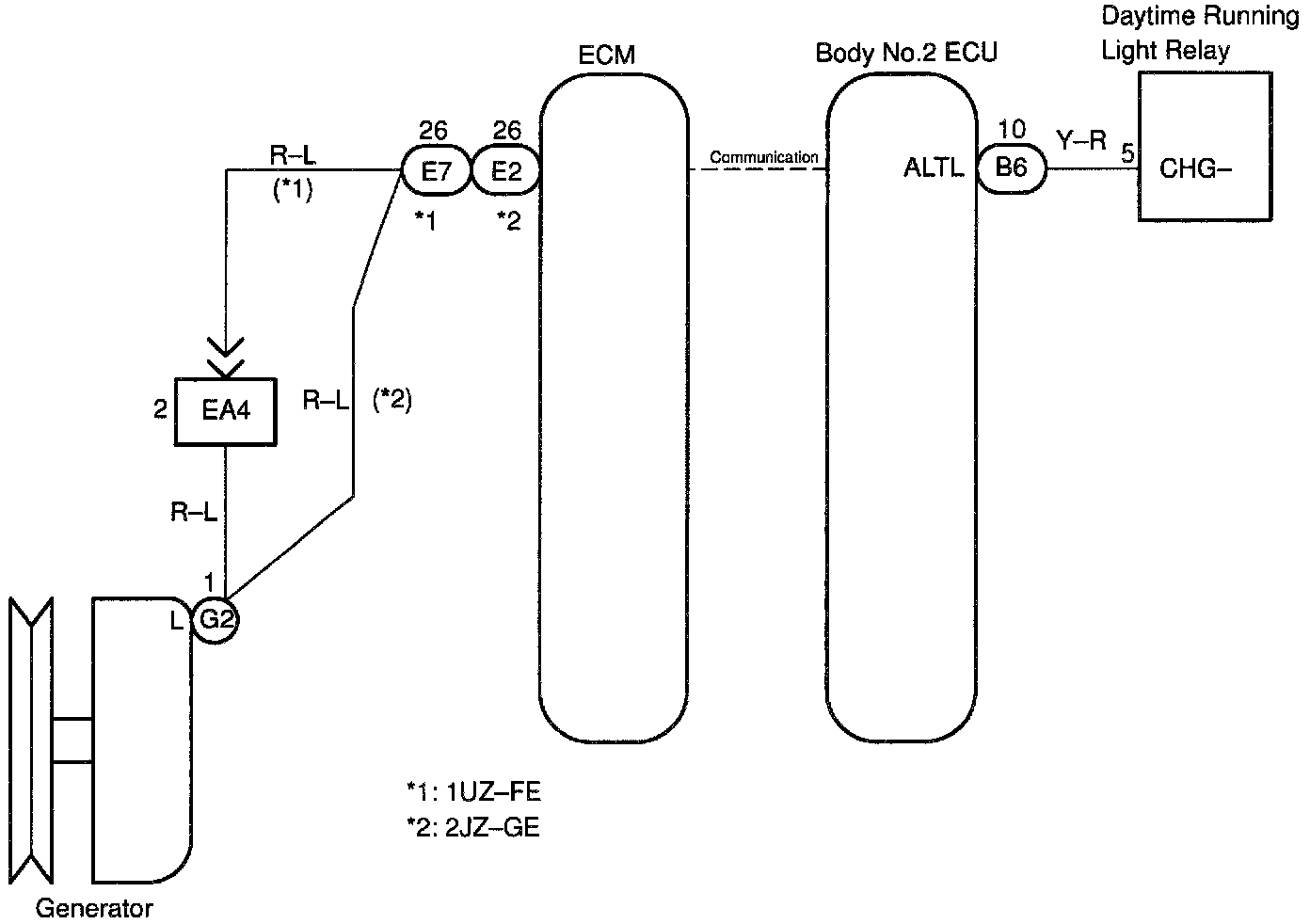 Body No.2 ECU receives the generator L signal from ECM through communication and outputs it to the Day time running light relay.