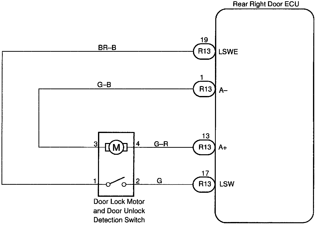 The door unlock detection switch is built in the door lock motor assembly. This switch is ON when the door lock knob is in the unlock position and OFF when the lock knob is in the lock position. The ECU detects the door lock knob conditions is this circuit. It is used as one of the operating conditions for the key confinement prevention function.