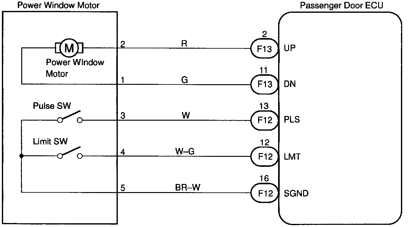 Jam protection limit switch is built-in the power window motor. This switch functions to turn "OFF" before the top dead center, and ECU reads this "OFF" signal resulting in closing the window fully.