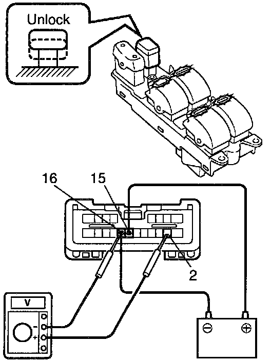 b. Connect the positive (+) lead from the battery to terminal 15 and the negative (-) lead to terminal 16, and check that all the illuminations light up.